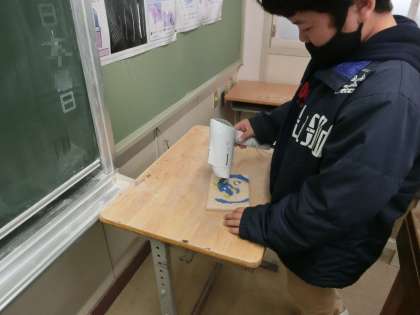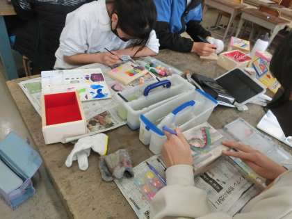 6年生の図工です。卒業制作で、グランドボックスをつくっています。彫刻ができた児童は、色塗りに進んでいます。