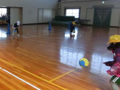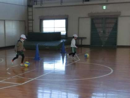 1年生の体育館での体育は、ボールを使って手や足でドリブルをしながらリレーをしていました。思い通りにボールが扱えるように、体の動かし方や力加減を学んでいきます。
