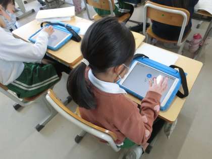 3年生の算数です。学習用タブレットのアプリを使って、かけ算の復習をしています。ハイスコアを目指して、集中して取り組んでいます。
