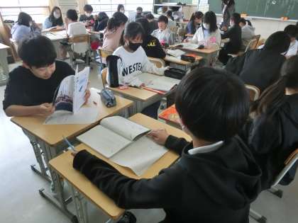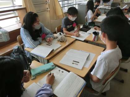 6年生の国語です、物語の登場人物の気持ちを考えて、朗読で表現する学習をしています。どのように朗読するとよいか、グループで自分たちの意見を出し合いながら話し合っています。