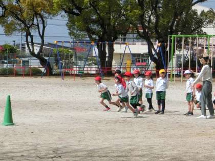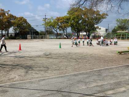 2年生の体育です。走力を高めるために、8秒間で何m走ることができるかに挑戦しています。決まった距離を走ってタイムを計測するのとは逆に、決められた時間で何m走れるかという課題は、目印のコーンを見てどれだけ走れたかという結果がすぐに分かるので、児童たちがどこまで走りたいという目標を作りやすく、走る意欲を高めています。
