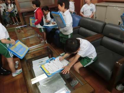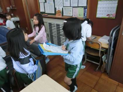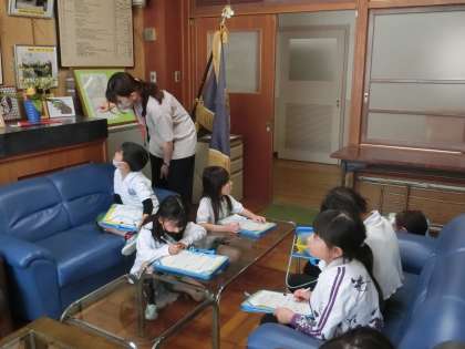 2年生の生活科です。1年生に学校のいろいろな場所を紹介するために、探検バックを持って取材活動を行っています。今日は、校長室で見つけたことをメモしていました。どんなひみつが見つけられたでしょうか。