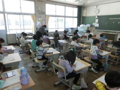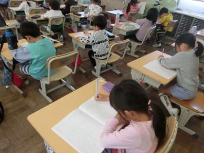 1年生の国語です。えんぴつの持ち方と、線の書き方を学んでいます。ワークを使って直線や曲線、折れ曲がった線など、いろいろな線を練習していました。担任の先生は一人一人のえんぴつの持ち方や線をかいている様子を確認しながら、声をかけています。