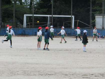4年生の体育です。体力テストのボール投げの記録が伸びるように、練習をしていました。投げる角度やボールをはなす手の位置など、工夫していました。時間がたつにつれ、ペアの児童の距離が長くなっていきました。