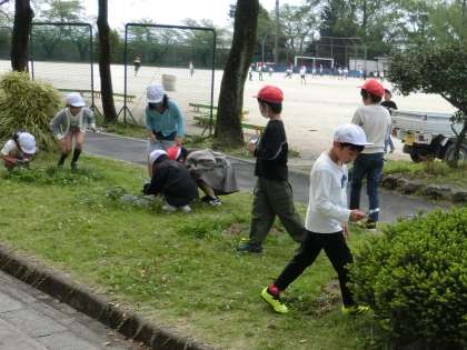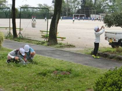 3年生の理科です。校内の春の生き物を観察しています。児童の発見が増えるように、ルーペ(虫めがね)を使って観察をしています。
