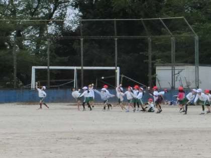 2年生の体育です。ボールを投げた後、走ってボールを拾いにいき、運動量を増やしていました。横並びで行うことで、自分の投げたり走ったりする力がどのくらいなのかを確認しやすくなっていました。学年に応じて、授業の展開の仕方を担任が工夫しています。