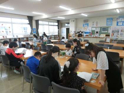 竹小タイムの「わかたけ図書館」では、多くの児童が本を読んでいました。中には、担任の先生と一緒に本を読んでいる児童もいました。