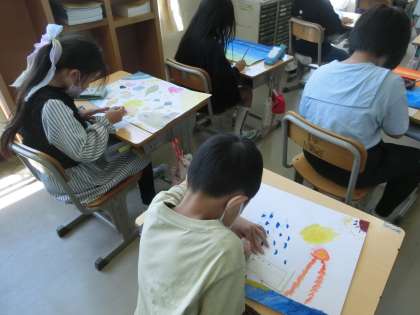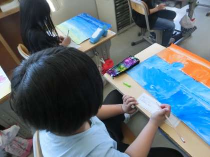 3年生の図工です。完成した水彩画の「作品名」や「かきながら考えたり、思ったりしたこと」を紙に書いて、みんなに紹介します。この授業は、作品作りの振り返りの時間です。作品作りを振り返りながら、できたことや次はこうしたいという思いを深め、次の作品作りにつなげていきます。