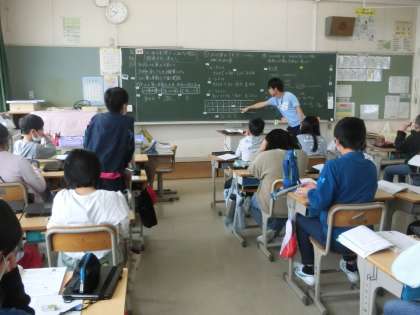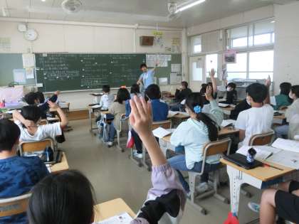 6年生の算数です。「文字と式」の学習で、関数を学んでいました。答えの出し方の発表では、同じ答えでもいくつもの考え方があることに気づきました。