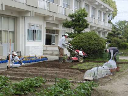 火曜日は、竹ボラさんが来校して学校の環境整備をしてくださっています。今日は、遊具周辺の草刈り、図工室前とプール横の畑の土づくりをしていただきました。5月には、児童たちが生活科や総合的な学習の時間に、野菜の苗やを植え始めます。