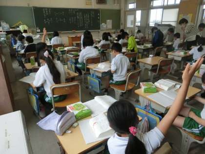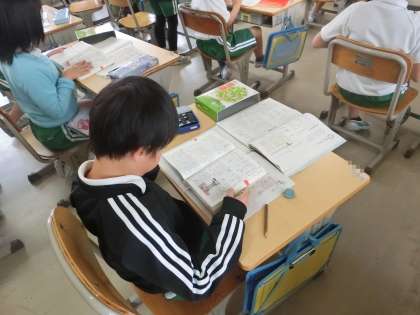 3年生の国語です。国語辞典の言葉の並び順を学びました。写真は、先生は言った言葉を探す練習です。見つけた児童は、手を挙げて正しく見つけられたかを先生に見てもらっていました。早く見つけようと、児童たちは集中して国語辞典のページをめくっていました。