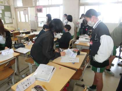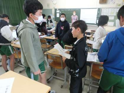「My treasure is … .」の会話がいろいろなところから聞こえてきました。紹介文を書くだけでなく、会話して話す力、聞き取る力も身につけていきます。