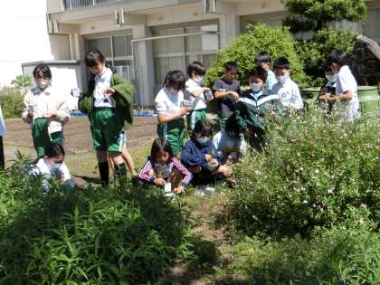 5年生の理科です。植物が芽を出すための条件を実験で確かめたあと、実験で使った植物を図工室の前の畑に持っていき、自然にかえしました。