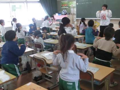 1年生の音楽です。2拍子や3拍子のリズムにあわせて、楽しく体を動かしていました。