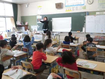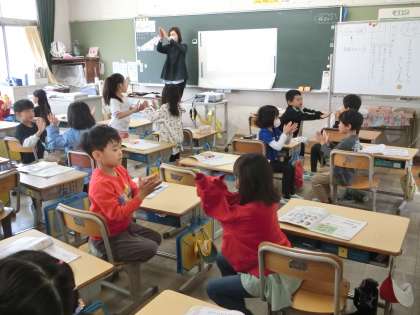 2年生の音楽です。「たぬきのたいこ」という曲に合わせて、ペアで手あそびを楽しみながら、リズム感を養いました。