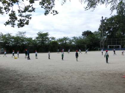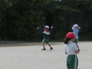 3年生の体育です。体力テストに向けて、ボール投げの練習をしています。遠くに飛ばすには、どんな山の形を思い浮かべるとよいかを先生が助言していました。