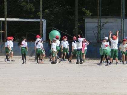 4年生の体育です。大きなボールでドッジボールをしていました。ボールの大きさが変わるので、ルールも工夫していたようです。