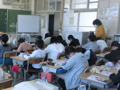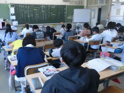 5年生の道徳です。物語を読んで、気持ちのよい挨拶をしたり、相手に礼儀正しくしたりすることのよさは、どんなところにあるのかなどを考えました。写真は、授業の振り返りのようすです。黒板に書かれた意見を参考に、授業で考えたことやこれからの生活で頑張りたいことなどをノートに書きました。