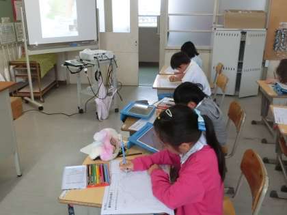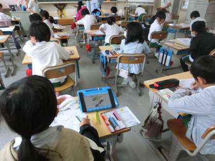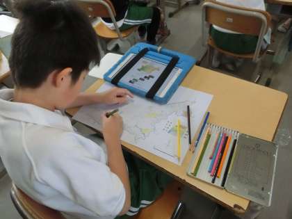 3年生の社会です。豊田市の土地の高さや広がりを知るために。白地図に色をぬっています。一人一人の学習用タブレットに示された資料を参考にしながら色をぬり、豊田市の地理的な地域性を学んでいきます。学習用タブレットに示された資料は、手もとにあるので一人一人が見やすく、細かい部分は拡大して詳しく見ることもでき、わかりやすい授業の手立てとなっています。