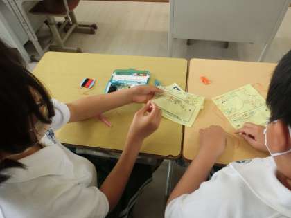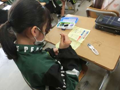 5年生の家庭科です。「マイバック」をつくるために、手ぬいの練習をしています。見に行った時には、名前のぬいとりを練習していました。