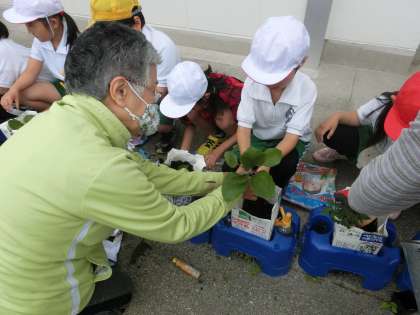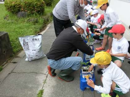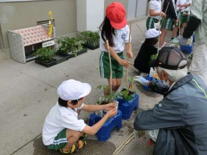 2年生の生活科です。野菜作りの授業が始まり、今日は竹ボラさんに教えていただきながら、自分たちが育てたい夏野菜の苗を一人一鉢に植えました。