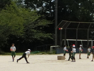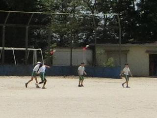 5年生の体育です。体力テストのボール投げに向けて、遠投の練習をしています。今回使用しているのは、ジャベリングボールです。遠くへ飛ばすための角度やフォームを身につけるための教具です。投げたかに慣れてきた児童は、飛距離がどんどん伸びていきました。