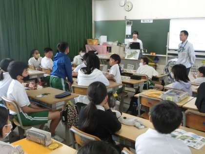 5年生の総合的な学習の時間です。外部講師の方から、トヨタ自動車の堤工場にあるビオトープについて教えていただきました。ビオトープにいるメダカを増やすために、5年生が学校でメダカを育てて卵を産ませ、繁殖していきます。今日は、メダカについても教えていただきました。教えていただいた後に、児童たちが質問したり、メダカを水槽に放流したりしました。メダカを育てることを通して命の大切さを感じる心も培われていきます。大切にお世話をしていきましょう。