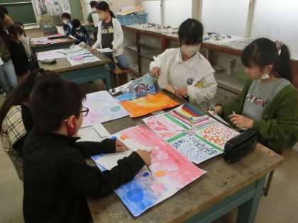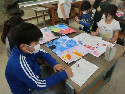 5年生の図工です。完成した作品の鑑賞を行っています。自分以外の作品を見ることで、新たな発見もあります。
