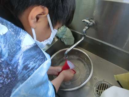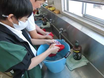6年生の家庭科です。赤白帽子を手洗いできれいにしています。家でも洗濯機を使うほどではない汚れは、手洗いできれいにできそうですね。