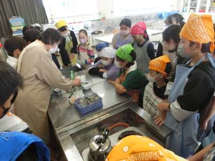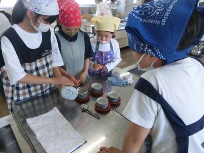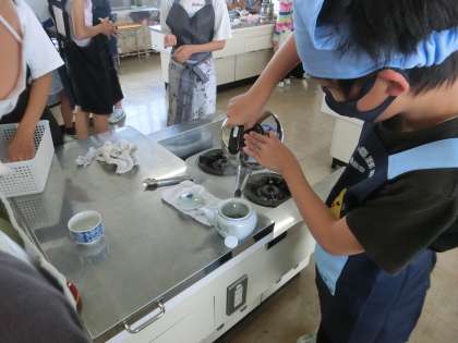 5年生の家庭科です。お茶のいれ方を学びました。お茶をいれるお湯の温度や、茶葉が入らないようにお茶を注ぐ方法を学びました。ご家庭でも、機会があればお子様におお茶をいれてもらってください。