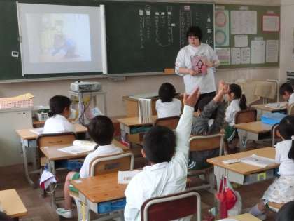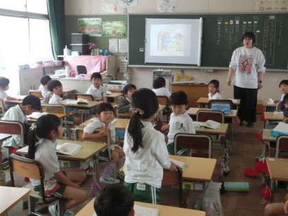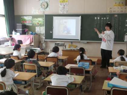 1年生の国語です。物語の場面の様子や登場人物の行動などの内容の大体を捉え、音読を楽しむことができるようになるために、場面ごとに気づいたことや主人公の気持ちを考えていました。黒板には、挿絵が映され、考えている場面や主人公の動きを視覚でもとらえて、考えやすくしています。