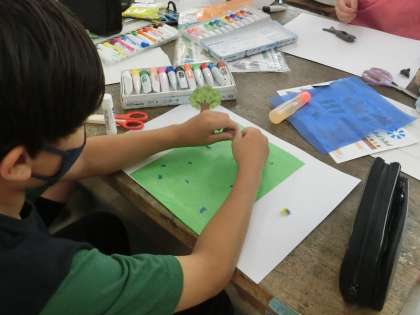 5年生の図工です。粘土で形をつくり、学習用タブレットでコマ撮りをして、クレイムービーを作ります。背景を工夫したり、ストーリーを工夫したりと創造力を働かせています。どんな作品ができあがるか楽しみです。