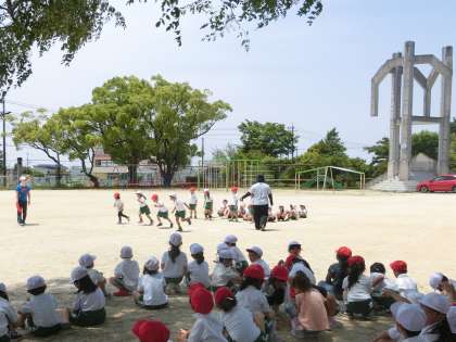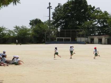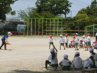1年生の体育です。4クラス合同で、体力テストの50m走の練習をしています。スタートの構えのときの手と足の位置も確認しながら行っていました。待っている児童たちは、走っている児童を元気よく応援していました。