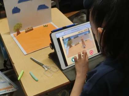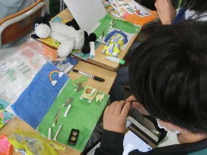 5年生の図工です。粘土で作った人形などを学習用タブレットで撮影して動画を作成しています。背景にも工夫して、制作が進んでいます。1コマ1コマの撮影がどんな動きになるのか楽しみです。