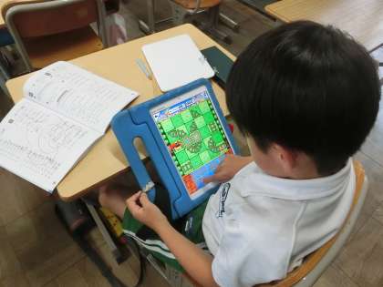 2年生の教室で、児童たちが学習用タブレットを使って復習をしています。ワークが早く終わった児童から学習用タブレットで学習用アプリを選択し、時間を有効に活用して学習しています。