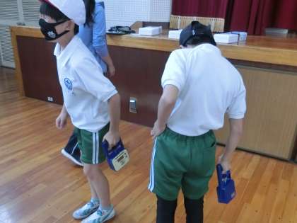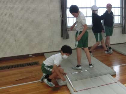 5、6年生が体力テストを行いました。効率的よく測定できるように2つの学年が合同で行いました。