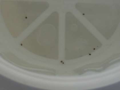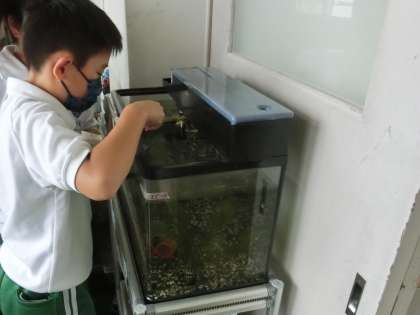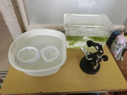 5年生のメダカの飼育が続いています。エサをあげたり、生まれた卵が食べられないように別の容器に取り分けています。近くには、休み時間にも卵の成長のようすが観察できるように拡大鏡が置かれています。