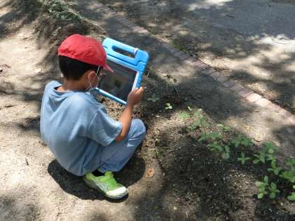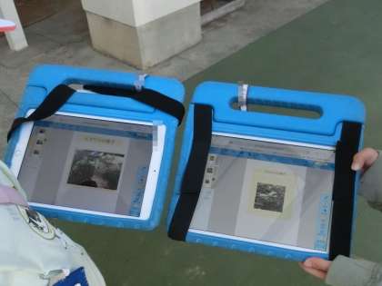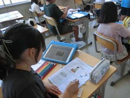 3年生の理科です。自分たちが育てている植物の観察をしています。畑に植えてから、どのように育っているかを学習用タブレットで写真に撮りました。教室では、写真を見ながら観察記録を作成しています。芽とは違う形の葉が出てきていることに気づいている児童もいました。