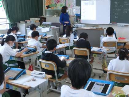 3年生の社会です。農家の仕事について、学習用タブレットに入っている副読本の資料を見ながら学んでいます。先生が説明している部分を児童たちも指でなぞりながら、確認しています。資料の内容について先生が質問すると、元気よく手を挙げる児童たちの姿が見られました。