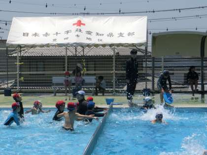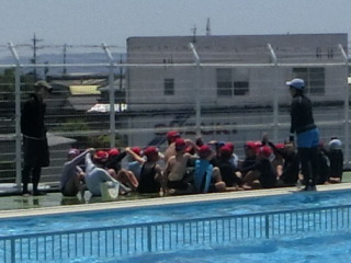 水泳学習では事故を防ぐために、準備運動をした後、プールに入る前にバディを確認(写真中)しています。どの学年でも教師の目視に加え、活動中や活動後もプールから上がるとバディで全員の無事を確認しています。また、高学年と帽子の色を変え、低学年の児童が深いプールに入っていないことも確認しています。