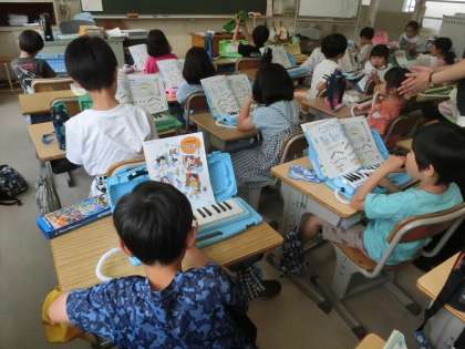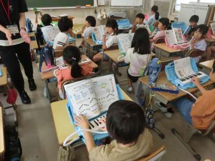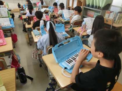 2年生の音楽です。鍵盤ハーモニカで「カエルの歌がきこえてくるよ」の曲を列ごとに追いかけながら演奏しました。児童たちは、途中でつられないで演奏しようと集中していました。