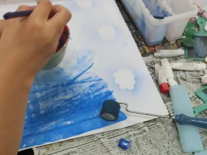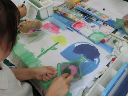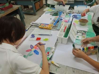 4年生の図工です。ブラシを使ったスパッタリングやローラーをつかった色付けなど、絵筆以外の技法もつかって、「幻の花」という課題で絵を描いています。