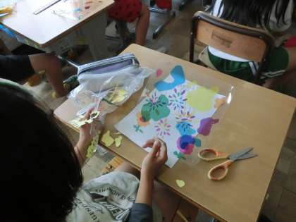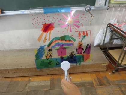 2年生の図工です。「ひかりのプレゼント」という教材で、ひかりを通して写る形や色を楽しむ作品を作っています。児童たちは6色のカラーシートを使って、作品作りに取り組んでいました。持ち手をつけるとウチワにもなります。