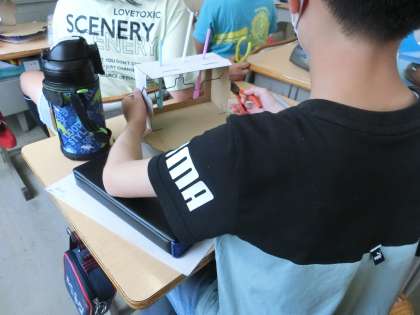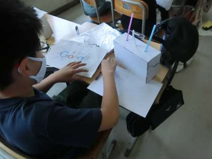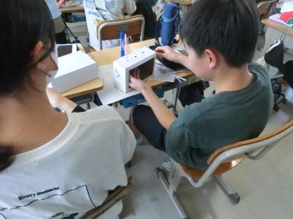 6年生の図工です。クランク(回すと上下に動くしくみ)を使った作品作りをします。クランクの動きをどのように作品に生かしていくかを考えることが、発想力を高めます。