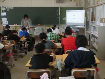 5年生の英語です。アルファベットの小文字を書く練習です。ホワイトボードで、書き順を確認し、ワークに書いていきます。「q」は数字の「9」に似ているなどの声も聞こえてきました。