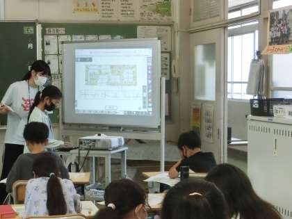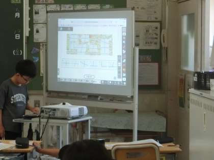 4年生の算数です。直線のいろいろな交わりを地図の道路の交わりの中から見つけています。どこに正解があるのかを、ホワイトボードに拡大して写された地図で確認しました。