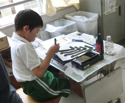 3年生の書写です。この時間は、「折れ」の部分を上手に書く練習をしていました。角の部分で向きを変えるときの力の入れ具合によって、毛筆の「折れ」が美しく書けますね。