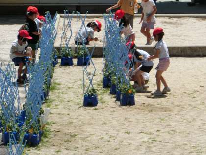 1年生が、水やりをして育てているアサガオのつるが伸びてきました。今では、鉢に支柱を立ててつるがうまく伸びるようにしています。