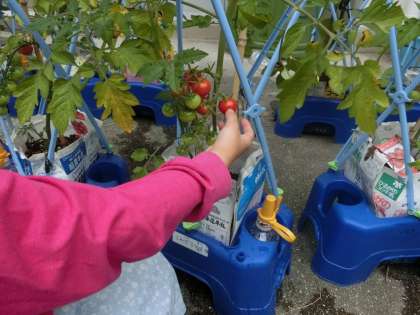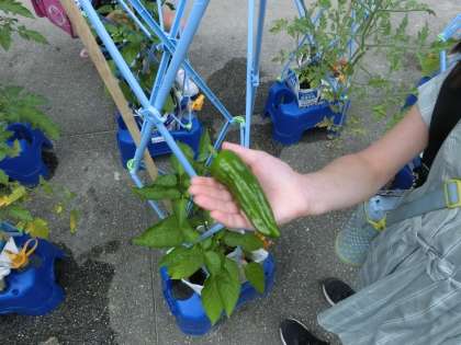 2年生が育てている夏野菜が、実っています。登校した児童は自分の野菜の育ち具合を観察し、食べごろになったものは収穫して持ち帰ります。ご家庭でどのように育てたかなどを話題にしながら、おいしくいただいてください。