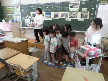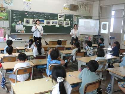 1年生の食育です。担任と栄養教諭の先生といっしょに、給食ができるまでを学び、給食を作ってくれる人の苦労や思いを考えました。給食に使う鍋の大きさを体験したり、鍋の中の食材をかきまぜる器具を実際に見せてもらったりもしました。感謝して、給食を食べようという気持ちが高まりました。